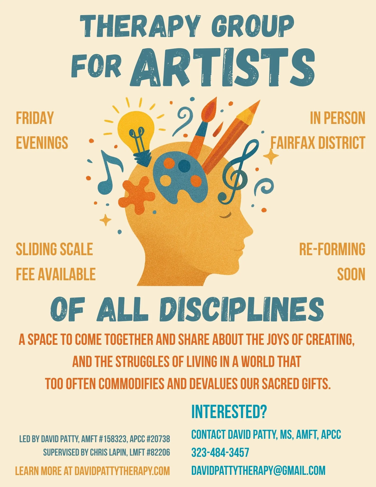 This limited-time, 6-week group brings together artists of all crafts and disciplines to talk about why it is that we create. To be able to express oneself through a creative medium is a sacred, mysterious, and often healing act. For many, it is the way that they feel most truthful to who they are, and most aligned with their purpose here on earth. This world, however, is structured around capitalism and productivity, which often extracts much of this joy and puts many artists in positions where they must compromise their vision or make choices for financial survival over creative truthfulness. This group aims to be a space to talk about these complexities, and ultimately come together in creative ways that lead to a meaningful shared experience.